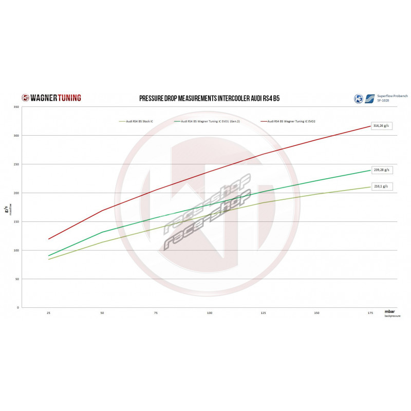 Високопроизводителният интеркулер WAGNERTUNING има ново състезателно ядро (най-новата технология Tube-Fin-Technology) с размери 255 mm x 260 mm x 120 mm (7,95 литра) / 10,0 инча x 10,2 инча x 4,7 инча (479, 4 инча³), който е разработен специално за ентусиастите на RS4 B5 с високо настроени автомобили. Това високоефективно ядро предлага 43% по-голяма предна повърхност и 147% повече обем на ядрото в сравнение със стандартния междинен охладител .
