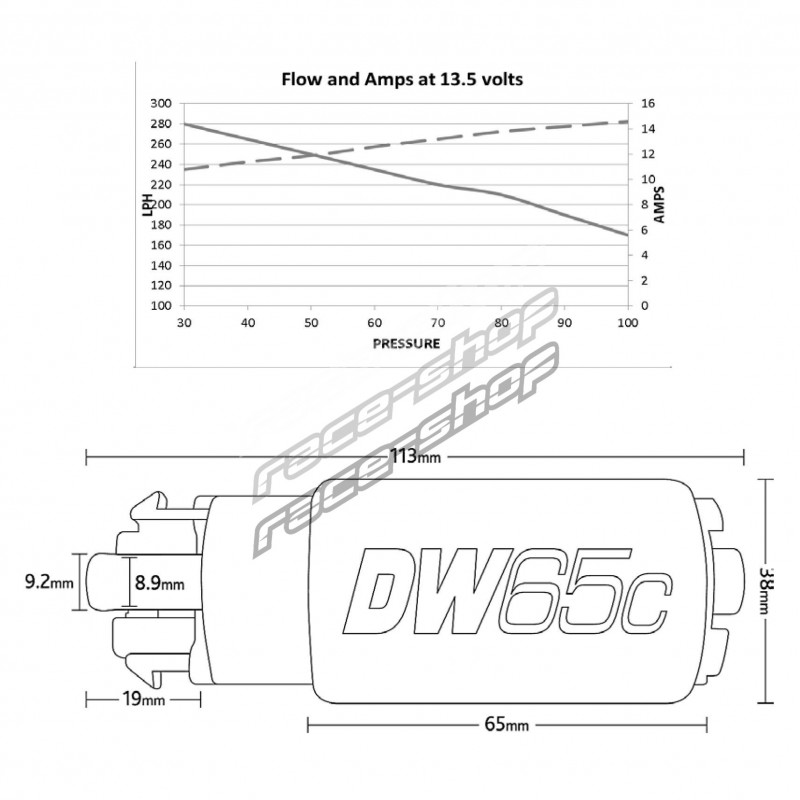 Deatschwerks DW65C (C за Compact) може да се побере в много модерни скоби, което помпа със стандартен размер (като DW200) не може. Горивната помпа Deatschwerks DW65C често се избира за надстройки на двигатели, които могат да надхвърлят 500 к.с., защото може да захранва 4x1100 cc / min инжектори непрекъснато, под 3 бара налягане на горивото (или 6x700 cc инжектори). Оборудван с тиха турбина и специално проектиран за етанол (E85).