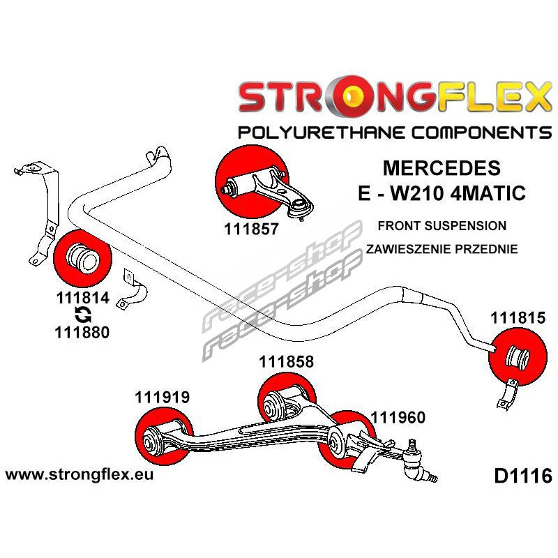 The E-W210 features two преден anti roll bar bushes, 111814 или 111880.