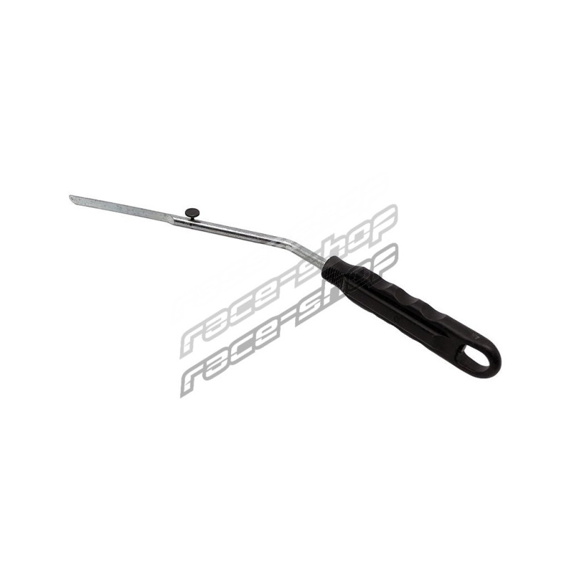 Удължен държач за режеща струна за автостъкла. Използва се за безопасно насочване на режещата струна в пролуката между стъклото и арматурното табло. Подходящ за всички видове струни. Режещата линия се затяга с фиксиращия винт и се прекарва през примката в края на държача. От друга страна, задната част насочва струната с помощта на "T" държача за струна (R930184).